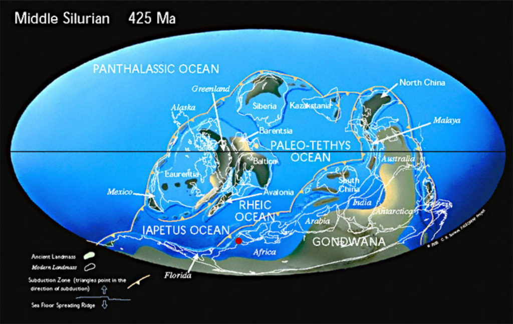 A lo largo del Paleozoico medio hubo cambios tectónicos importantes en nuestra región. Las dos placas que configuran las dos unidades téctonicas del macizo ibérico onubense toman derivas completamente diferentes. Avalonia, lo que se corresponde actualmente a Andévalo y Cuenca Minera se mueve hacia el NW en el Ordovícico medio (480 ma) llegando a colisionar con la placa Báltica y ésta con Laurentia formando un supercontinente: LAURASIA. Mientras tanto, Armórica (Sierra de Aracena) seguiría «ligada» a Gondwana unos años más, en su movimiento hacia el polo sur. Entre ellas, se produjo el nacimiento del Oceáno Rheico.