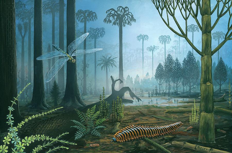 Reconstrucción del mundo del Carbonífero. Dibujo: Richard Bizley